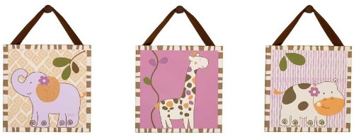 | Cocalo Jacana 3 Piece Canvas Art. This adorable collection features friendly safari animals in vibrant colors with cute appliqués and embroidered details. An arrangement of nature inspired prints and textured fabrics in various shades of orchid, yellow, lavender, brown and accents of orange are complemented by a fun allover print creating a lovely and comfortable nursery for your sweet miss explorer.This canvas art is 10inches x 10inches. ...Read more |